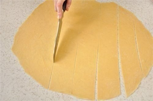 Разделить тесто на 2 части, и каждую часть тонко раскатать на присыпанном мукой столе. Оставить тесто минут на 10, чтобы подсохло и легче резалось. Раскатанные листы разрезать на полосы шириной 5 см. Полосы сложить пополам, и положить по три полосы друг на дружку, присыпав немного между собой мукой (для того, чтобы они не слипались).
