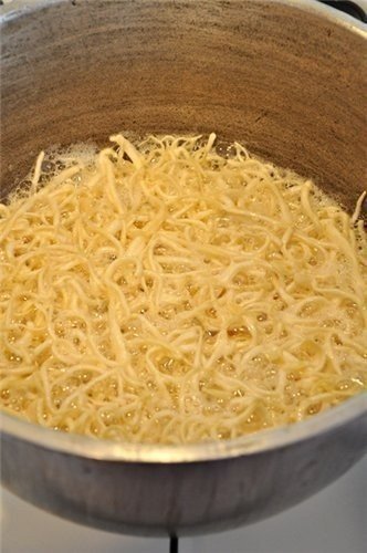 В казане разогреть растительное масло, и частями, маленькими партиями(примерно горсть), по-быстрому (на среднем огне), обжарить лапшу. Обжариваем буквально 1-2 минуты, пару раз помешав. Чуть только позолотела лапша сразу же вынимаем шумовкой, и выкладываем в чашку на бумажную кухонную салфетку, чтобы она впитала весь лишний жир. Лапшу не пережаривайте, она должна быть светло-золотистого цвета.