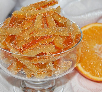 Закипятить сироп из 1400 г сахара и 600 мл воды, и опустить в него корочки цитрусовых. Как только сироп закипит, снять с огня, остудить и поставить на 8- 10 часов в холодное место После этого опять проварить корочки в сиропе в течение 5 минут после закипания, и опять поставить в холодное место на 24 часа. Чередование варки и охлаждения повторить 4-5 раз. В конце последней варки в сироп добавить сок одного лимона и цедру. Для проверки готовности цукатов, необходимо наколоть на вилку одну корочку и вытащить из сиропа. Если корочка имеет блестящую поверхность и сироп медленно стекает с вилки — цукаты готовы. Готовые цукаты откинуть на дуршлаг, выдержать до полного стекания сиропа (1,5 — 2 часа).
