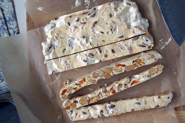 Переложите массу в форму, сверху закройте также бумагой для выпечки. Оставьте противень и сладость остывать в сухом месте на пару часов, а лучше на ночь. После того, как нуга застыла, нарежьте ее на длинные полоски очень острым ножом. Оберните нугу в пергамент и храните в сухом прохладном месте или в холодильнике.