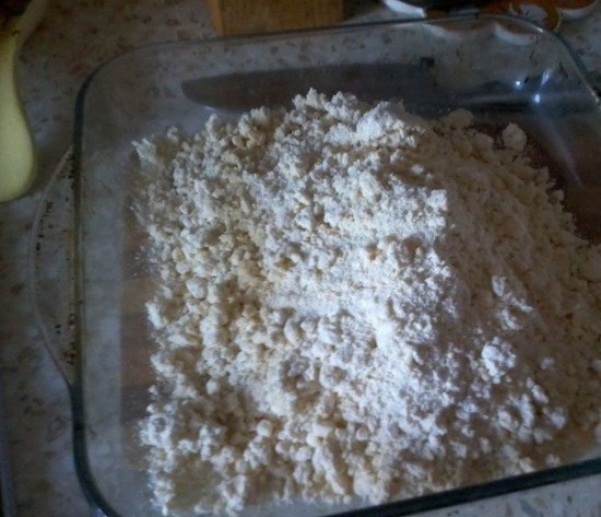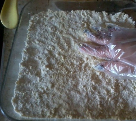 2. Вот такая крошка получилась, теперь высыпаем эту крошку в форму, хорошенько утрамбовываем, разравниваем. Ставим в духовку при 180 град. на 20 минут