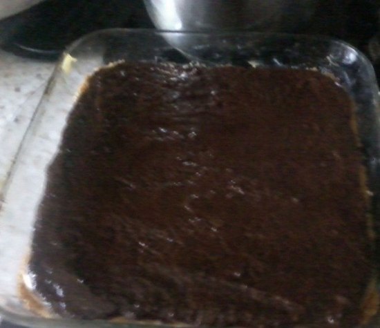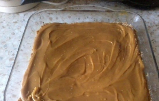 6. Шоколад топим в микроволновке или на водяной бане. Выливаем шоколад сверху на карамель, хорошо разравниваем и убираем в холодильник для полного застывания.