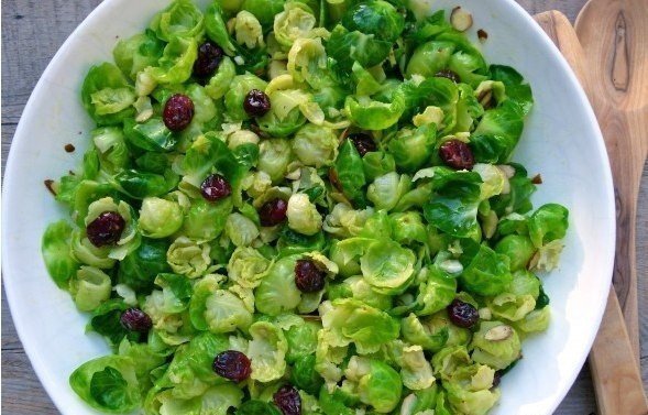 В салатницу выложите брюссельскую капусту, клюкву и миндаль. Заправьте соусом и дополнительно приправьте по вкусу.