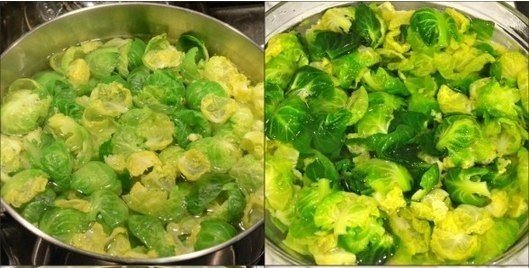 Подготовьте большую миску с ледяной водой. Разберите брюссельскую капусту на отдельные листья. В большой кастрюле с соленой кипящей водой (около 1 столовой ложки соли) бланшируйте листья брюссельской капусты (меньше 2 минут, чтобы они не потеряли цвет). Слейте воду и немедля переложите их в ледяную воду. Слейте и ледяную воду, высушите насухо.