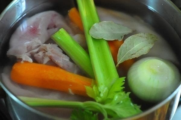 Куриные грудки отварить с морковью, несколькими стеблями сельдерея, луком, перцем горошком и лавровым листом, добавив соль. Варить следует не более 15-ти минут. Когда мясо сварится, оставить его на 10 — 15 минут в бульоне.