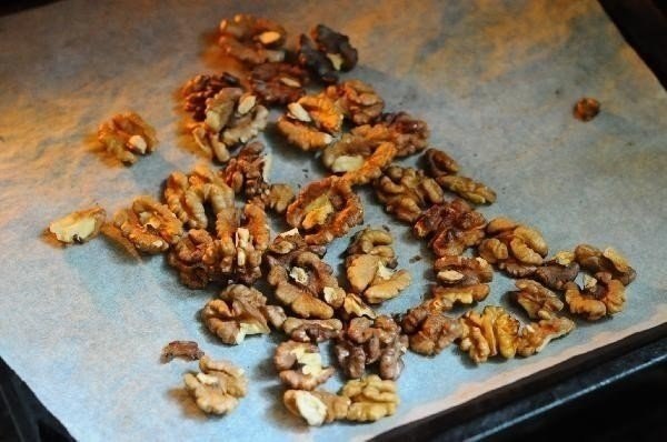 Орехи разложить на противне на пергамент и поджарить в духовке, разогретой до 180 градусов, около 5 — 8 минут, иногда переворачивая.
