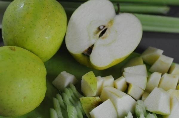 Яблоки нарезать квадратными кусочками, сельдерей очистить от волокон и порезать поперек и чуть наискось небольшими кусочками. Яблоки сбрызнуть соком половины лимона.