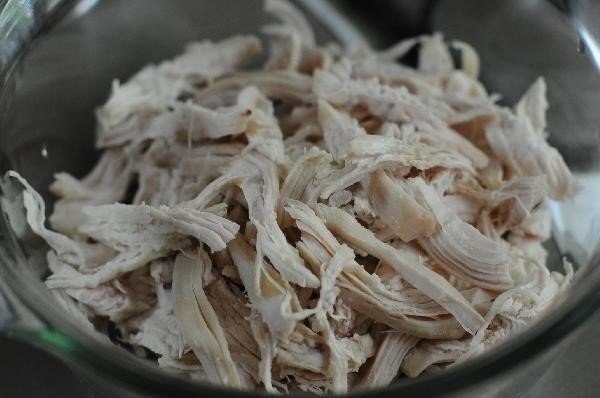 Остывшие куриные грудки разделить на волокна.