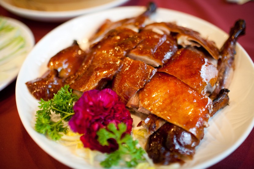 9. Во время трапезы, кусочки утки заворачиваются в блинчики смазанные соусом хойсин вместе с луком и огурцом.