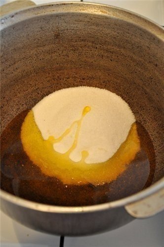 В казан налить 1 ст. мёда и 1 ст. сахара, разогреть, довести до кипения, постоянно помешивая, дать покипеть минуты три, выключить огонь.