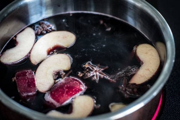 Добавить яблоки, мандарины, сахар, гвоздику. Затем добавить вино (вино из смородины/вишневое вино/потрвейн) и варить на среднем огне не доводя до кипения, помешивая. Снять сразу же, как появится белая пена.