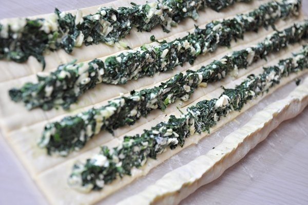 На каждой полоске равномерно, по всей длине, распределить всю начинку.