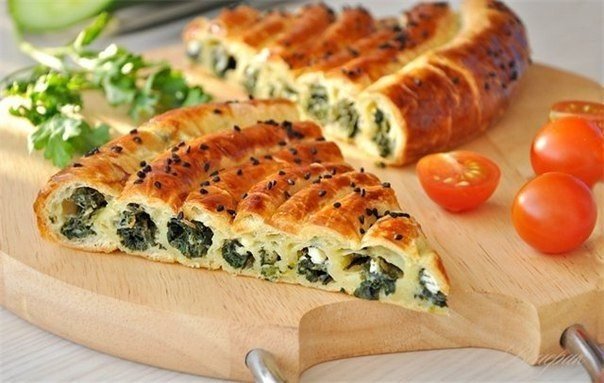Спиральный пирог обмазать желтком, посыпать кунжутом, и отправляем в уже нагретую духовку до 180 гр. на 20-25 минут, до золотистой корочки.