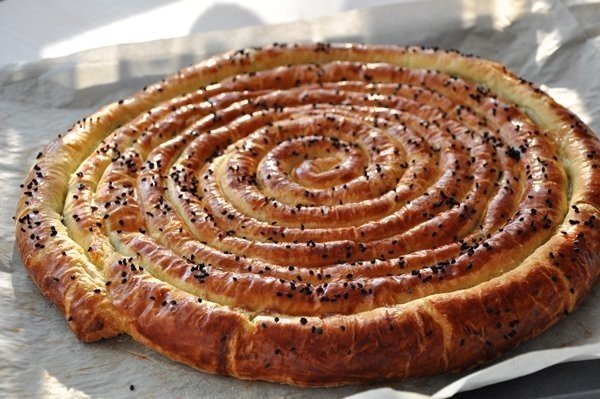 На противень, застеленный бумагой для выпечки, с середины начинаем выкладывать наши жгуты(швом вниз) в виде спирали, скрепляя их между собой.