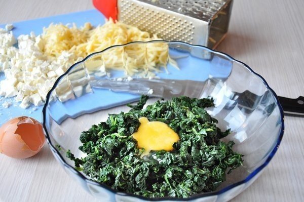 Добавить к шпинату одно сырое яйцо, натёртый твёрдый сыр, мелко нарезанную Фету, посолить, поперчить, смешать.
