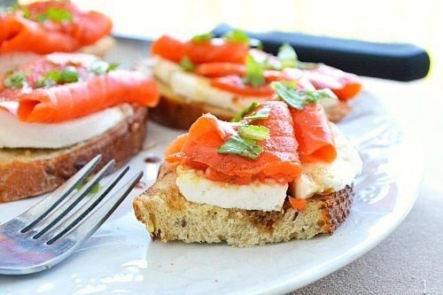 Хрустящие бутерброды с моцареллой и копченым лососем.