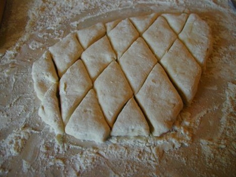 Тесто делим на 4 части и раскатываем толстой лепешкой (1см), нарезаем ромбиками со сторонами примерно 3-4 см.