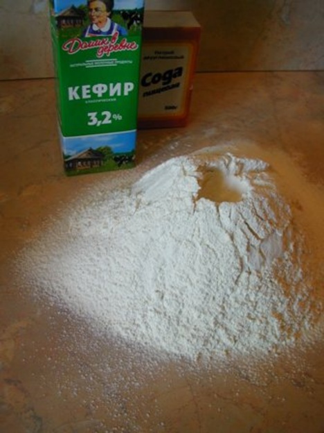 Муку высыпаем горкой на стол, делаем ямку в центре, всыпаем соду, соль и потихоньку добавляем кефир.