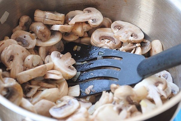 В кастрюле с толстым дном разогреваем 2 ст.л. растительного масла. Кладем лук и жарим, помешивая, около 3-4 минут.Добавляем грибы и жарим до мягкости, еще около 5-7 минут. Добавляем "бульон", доводим до кипения.