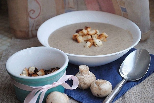 Измельчаем при помощи погружного блендера.Добавляем соль и перец по вкусу и держим суп на маленьком огне еще 7 минут. Затем вливаем сливки, еще раз доводим до кипения и снимаем с огня.Подаем с сухариками.