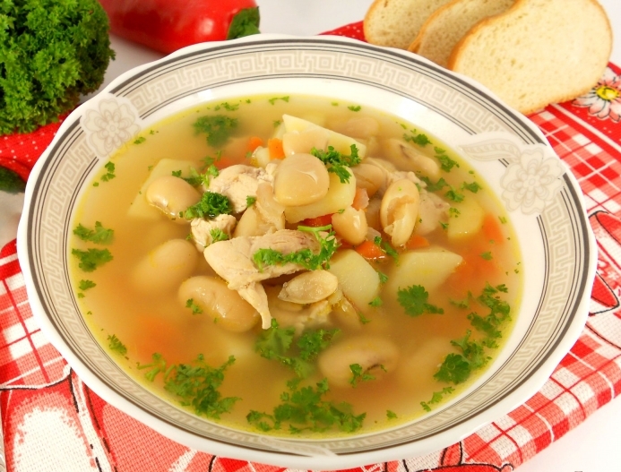 Картофель порезать и добавить к остальным продуктам вместе с фасолью (фасоль предварительно замочить на ночь). Влить горячую воду и варить на маленьком огне 1 час.
