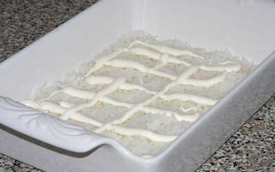 В салатницу выложите слой вареного риса и смажьте майонезом.