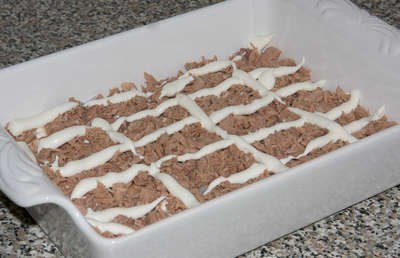 Вторым слоем выложить рыбную консерву и снова смазать майонезом.