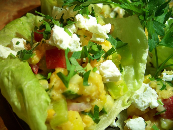 На тарелку выложить листья салата Айсберг, заполнить их получившейся смесью, посыпать брынзой и зеленью.