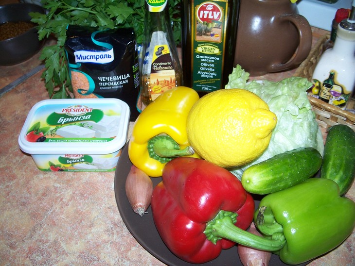 Соединить все ингредиенты с чечевицей, аккуратно перемешать.