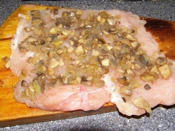 Грибы и лук мелко порезать, обжарить на сковородке, слегка подсолив и поперчив. Дать остыть, после чего выложить на отбивные.