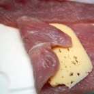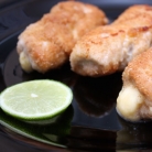 Грудку индейки нарезаем вдоль на тонкие пласты, затем отбиваем так, чтобы пласты получились очень тонкими и гибкими. Заворачиваем в каждый пласт небольшой кусочек сыра.