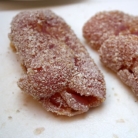 У вас должны получиться красивые рулетики. Если разваливаются — скрепите зубочисткой или специальными пищевыми нитками. Затем обмакиваем каждый рулетик во взбитое яйцо.