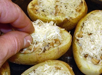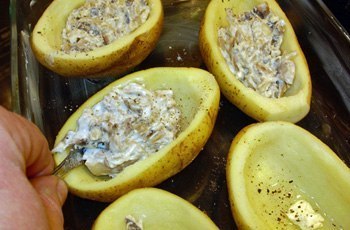 Затем в картофельные "кокотницы" положим ложкой тушенные в сливках грибы, равномерно распределяя их по "кокотницам".