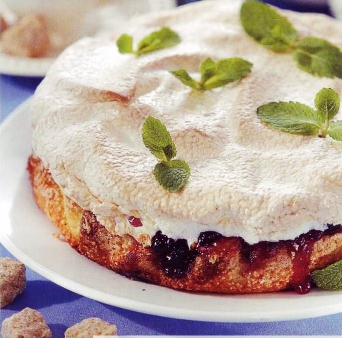 7. Уменьшите огонь в духовке. Выложите начинку и залейте взбитыми белками (предварительно удалив горох и пергаментную бумагу), поставьте в духовку еще на 15 минут.