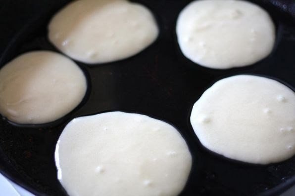 Противень или большую сковородку смазать маслом, присыпать мукой и выложить тесто ложкой. Тесто должно немного растечься.