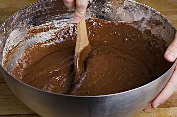 В большой миске смешиваем вместе все сухие ингредиенты (муку, сахар, какао, разрыхлитель теста, соль)Делаем в смеси три углубления, два небольших и одно большое.