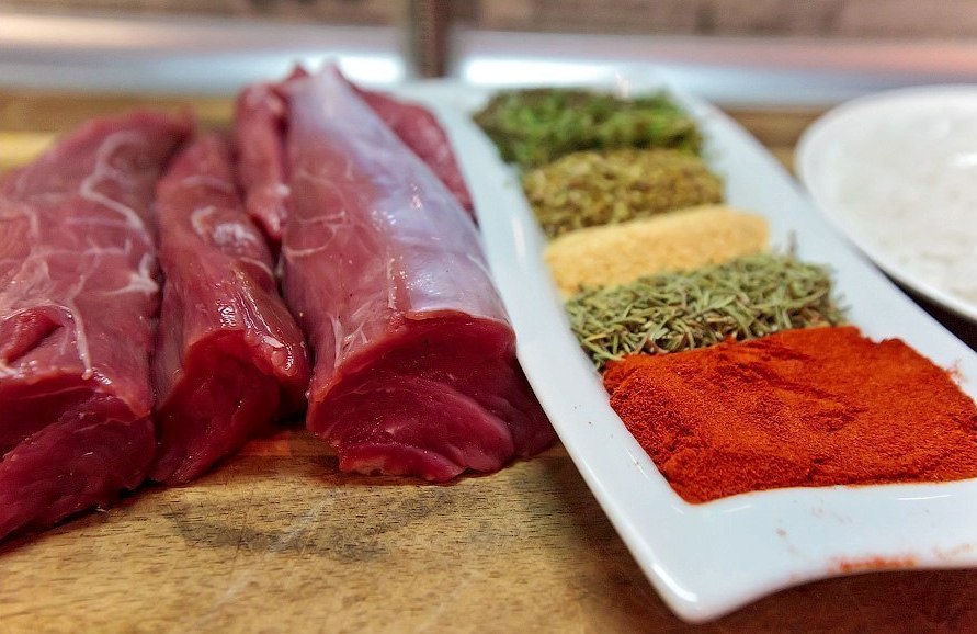 Мясо освободить от пленок и жил, если используется крупная мышца — разделить ее на длинные не толстые части. Если используется вырезка — разрезать пополам, чтобы был ровный срез и отрезы были не такими длинными.