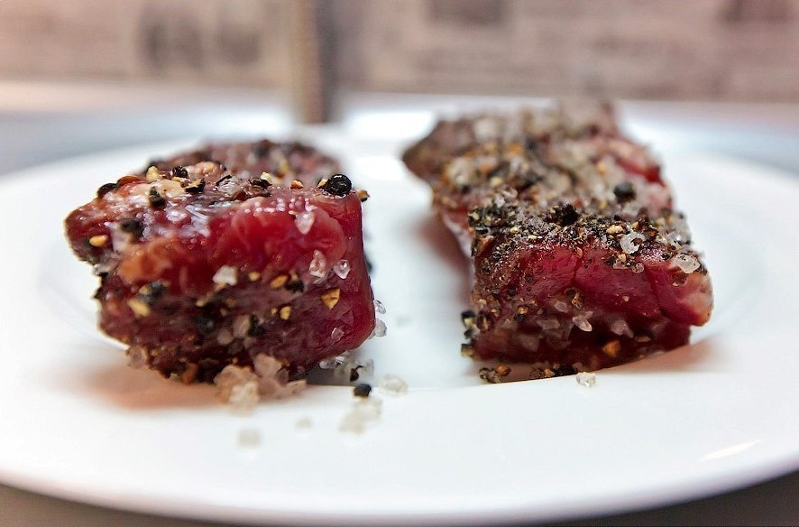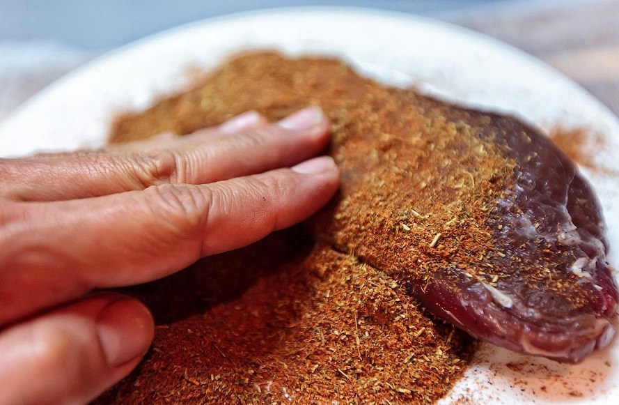 После чего хорошо моем его от соляно-перечной смеси и высушиваем бумажными полотенцами или чистой хлопчатобумажной салфеткой. Важно, чтобы мясо было сухим.