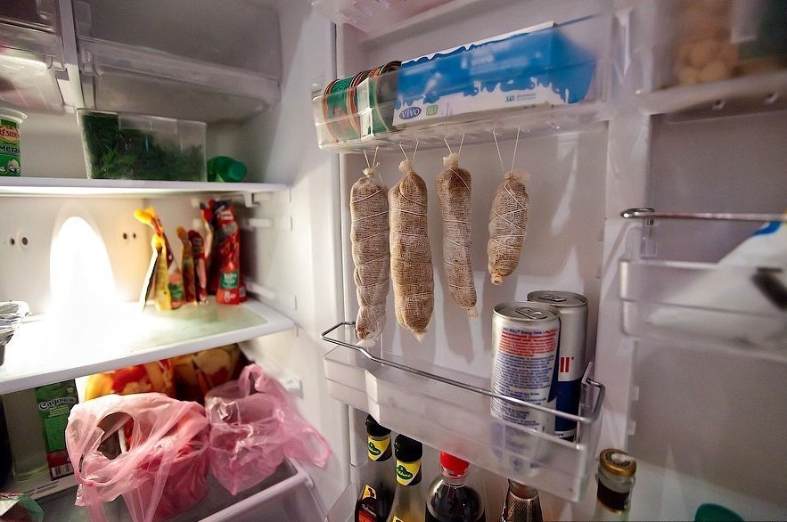 После чего подвешиваем брезаолу в холодильнике. Если подвесить мясо возможности нет, можно положить на деревянную досточку, но обязательно нужно регулярно (несколько раз в день) переворачивать тушки мяса в марлевых пеленках.
