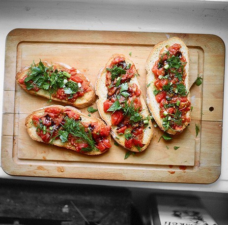 4. Поджаренный хлеб пропитать оставшимся оливковым маслом, разлив понемногу на каждый ломоть. Сверху выложить теплые помидоры, посолить по вкусу, посыпать свежемолотым черным перцем и мелко нарезанной зеленью — любой, какая окажется под рукой. И подавать как закуску — например к вину.