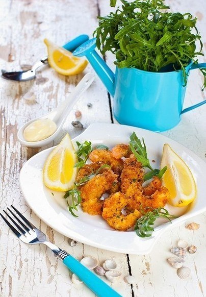 — Креветки обвалять в муке, стряхнуть лишнее, обмакнуть во взбитое яйцо и обвалять в панировке из крошек и пармезана.