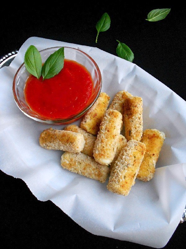 Палочки моцареллы разрежьте напополам, чтобы получилось 12 половинок. Положите их примерно на час в морозилку до полной заморозки.