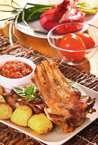 4. Картофель очистить, каждый клубень разрезать пополам, обмазать оставшимся маслом и обжарить на разогретом гриле вместе с мясом. Подавать с соусом.