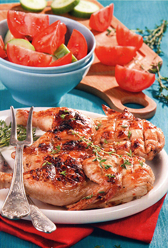 5. Гриль или решетку разогреть, смазать маслом. Выложить цыплят, закрепить решетку потуже и жарить цыплят сначала на одной стороне, затем на другой — до готовности.