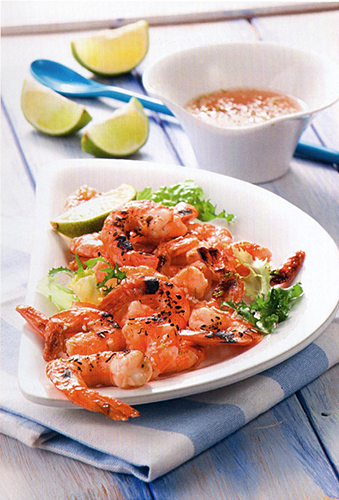 4. Гриль разогреть, смазать маслом. Жарить на гриле креветки по 2 мин с каждой стороны.