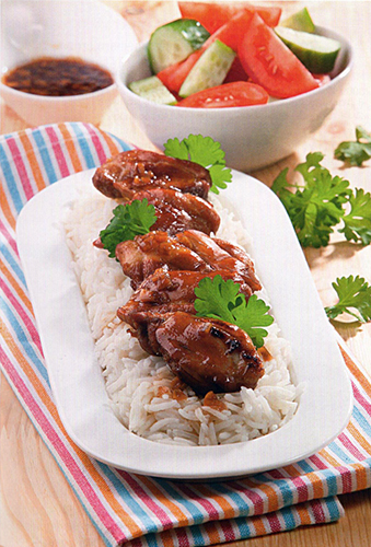 6. Подавать курицу на подушке из риса с нарезанными свежими овощами.