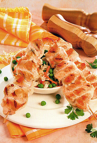 5. Куриное филе вынуть из маринада, смазать оливковым маслом, нанизать на шпажки, предварительно вымоченные в воде, обжарить на гриле в течение 15 мин. На гарнир подать гавайскую смесь.