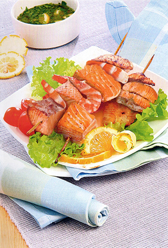 1. Филе горбуши и креветки ополоснуть и обсушить. Рыбу нарезать кубиками и, чередуя с креветками, наколоть на шпажки. Смешать лимонный сок с вустерским соусом. Шашлык посолить, поперчить, сбрызнуть полученной смесью и оставить на 10 мин.