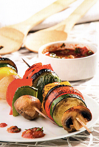 4. Грибы вымыть, разрезать пополам. Овощи и грибы нанизать на шпажки вперемежку с помидорами. сбрызнуть оливковым маслом и обжарить на гриле до готовности в течение 15 мин. Подавать готовый шашлык с соусом карри.