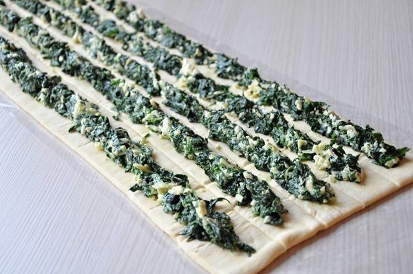На каждой полоске равномерно, по всей длине, распределить всю начинку.